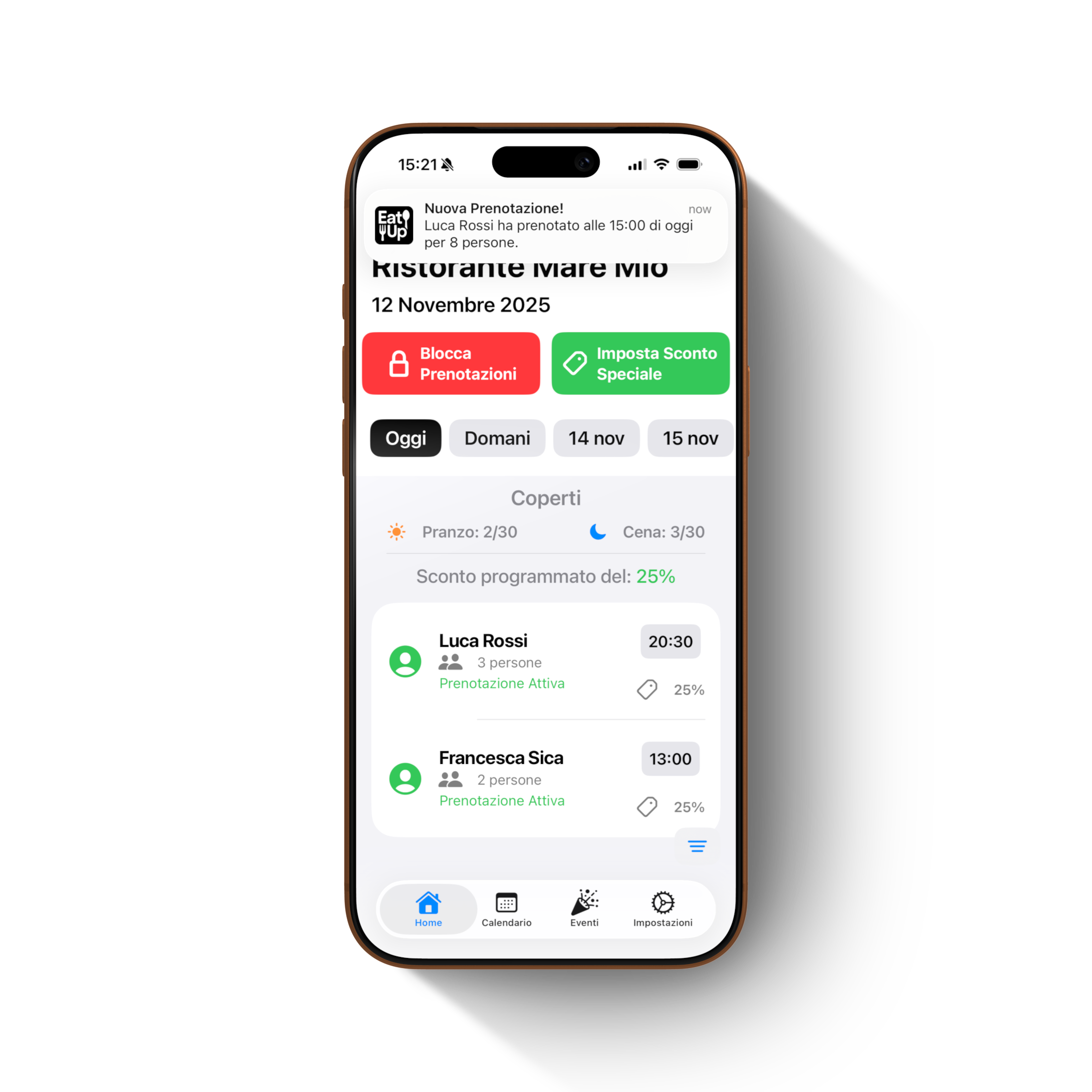 EatUp semplifica la gestione quotidiana del tuo ristorante centralizzando prenotazioni, eventi e promozioni.